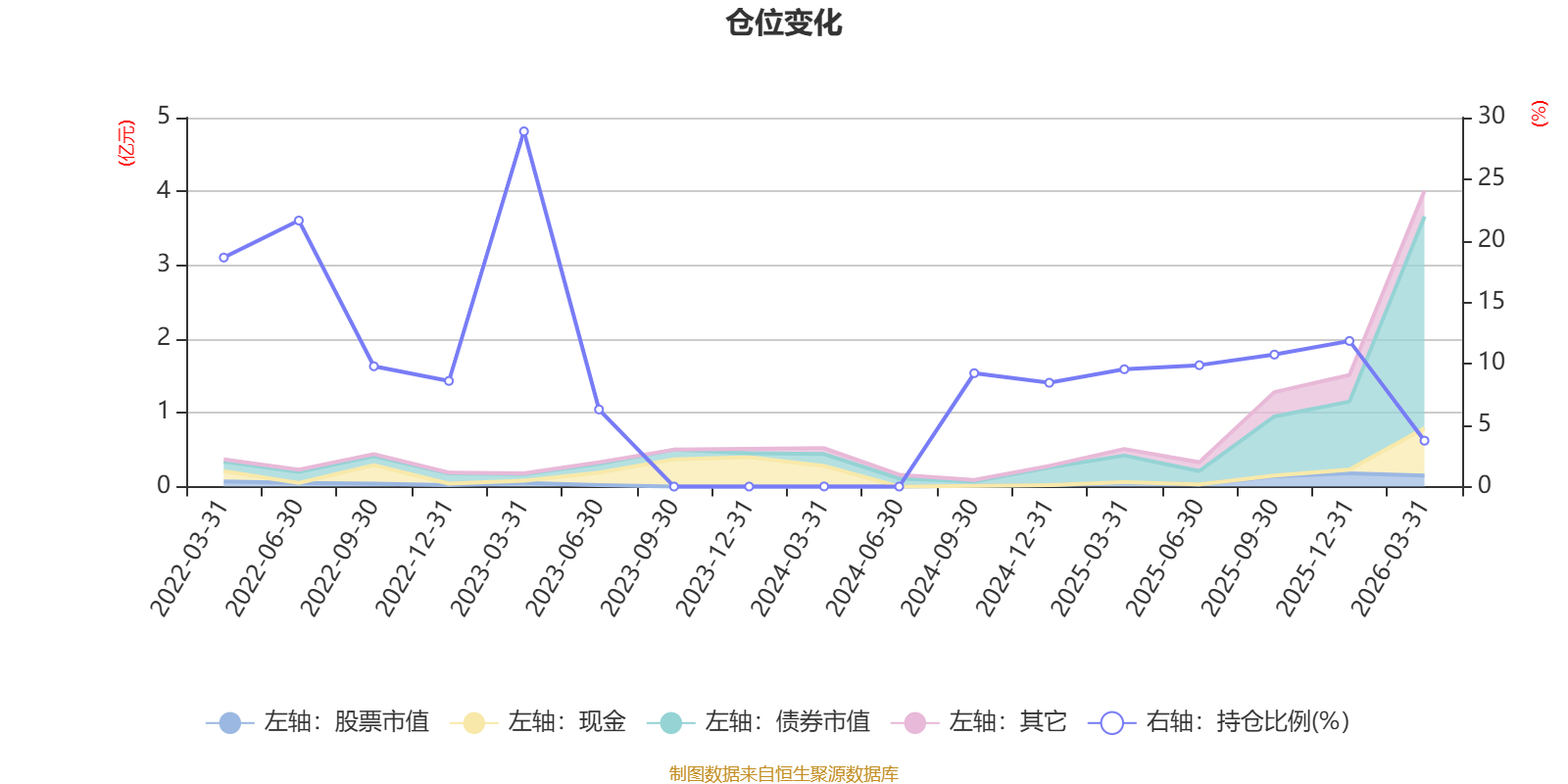 据定期报告数据统计,近三年平均股票仓位为5.8%,同类平均为19.07%。2023年一季度末基金达到28.88%的最高仓位,2024年一季度末最低,为0.01%。