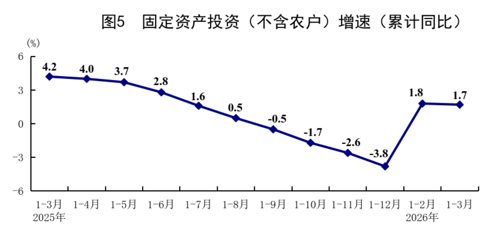 一季度,全国固定资产投资(不含农户)102708亿元,同比增长1.7%,上年全年为下降3.8%;扣除房地产开发投资,全国固定资产投资增长4.8%。分领域看,基础设施投资同比增长8.9%,制造业投资增长4.1%,房地产开发投资下降11.2%。全国新建商品房销售面积19525万平方米,同比下降10.4%;新建商品房销售额17262亿元,下降16.7%。分产业看,第一产业投资同比增长15.9%,第二产业投资增长5.8%,第三产业投资下降1.0%。民间投资同比下降2.2%,降幅比上年全年收窄4.2个百分点;扣除房地产开发投资,民间投资增长1.3%。高技术产业投资同比增长7.4%,其中计算机及办公设备制造业,航空、航天器及设备制造业,信息服务业投资分别增长28.3%、19.0%、20.9%。3月份,固定资产投资(不含农户)环比增长0.52%。