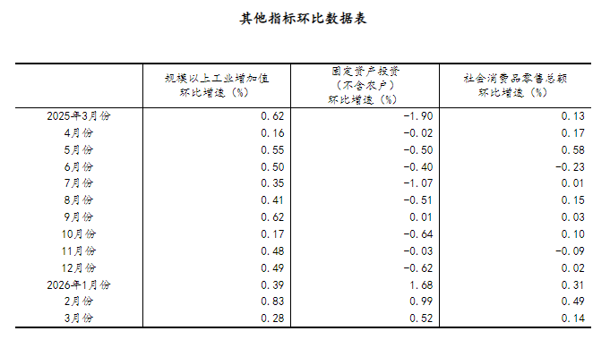 (2)根据季节调整模型自动修正结果,对近一年来各期国内生产总值、规模以上工业增加值、固定资产投资(不含农户)、社会消费品零售总额环比增速进行修订。修订结果及2026年一季度GDP环比数据、2026年3月份其他指标环比数据如下: