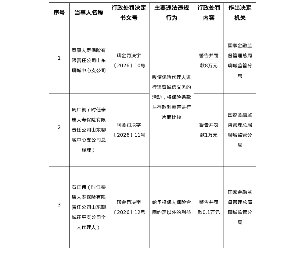 针对上述违法违规行为,国家金融监督管理总局聊城监管分局对其警告并处罚款8万元;对时任泰康人寿保险有限责任公司山东聊城中心支公司总经理周广凯,警告并处罚款1万元;对时任泰康人寿保险有限责任公司山东聊城茌平支公司个人代理人石正伟,警告并处罚款0.1万元。