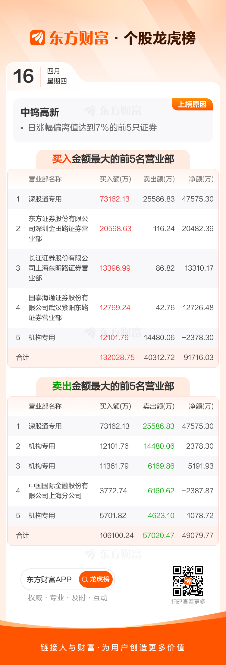 交易所2026年4月16日公布的交易公开信息显示,中钨高新因成为日涨幅偏离值达到7%的前5只证券上榜。中钨高新当日收报51.9元,涨跌幅10.00%,偏离值8.20%,换手率8.58%,成交额61.31亿。