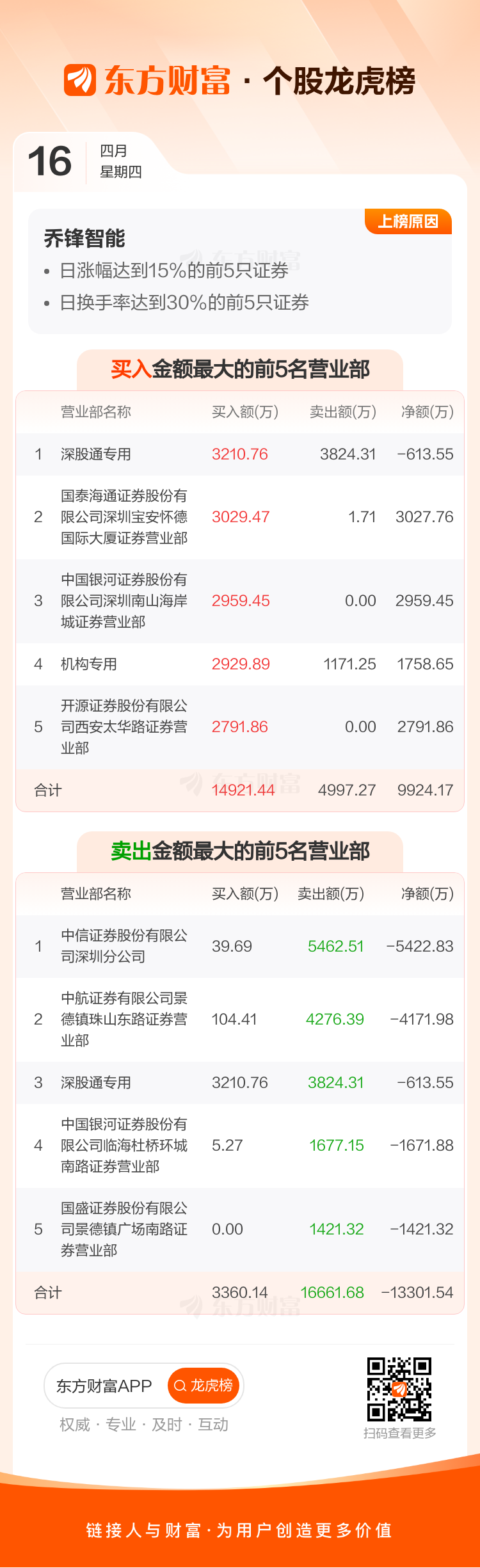 交易所2026年4月16日公布的交易公开信息显示,乔锋智能因成为日涨幅达到15%的前5只证券、日换手率达到30%的前5只证券上榜。乔锋智能当日收报90.41元,涨跌幅20.00%,偏离值20.00%,换手率32.64%,成交额10.66亿。