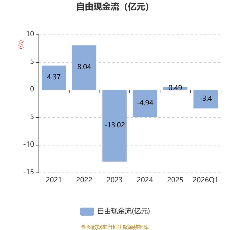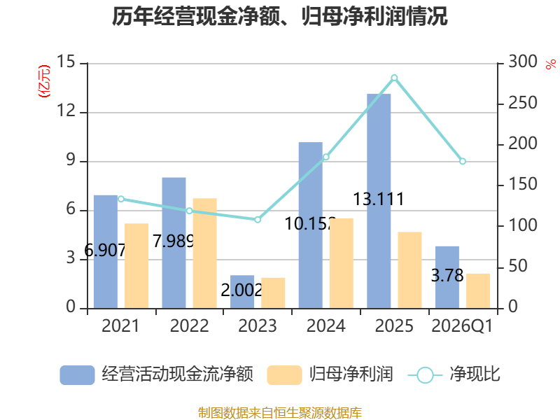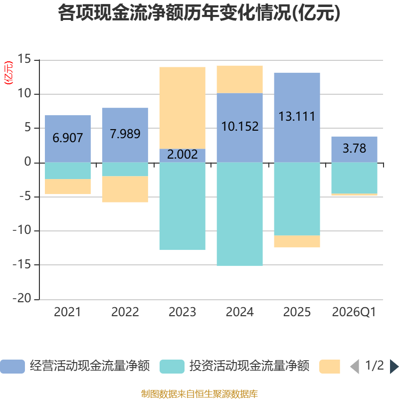 截至2026年一季度末,公司经营活动现金流净额为3.78亿元,同比增长99.97%;筹资活动现金流净额-2724.24万元,同比减少1.12亿元;投资活动现金流净额-4.56亿元,上年同期为-2.73亿元。