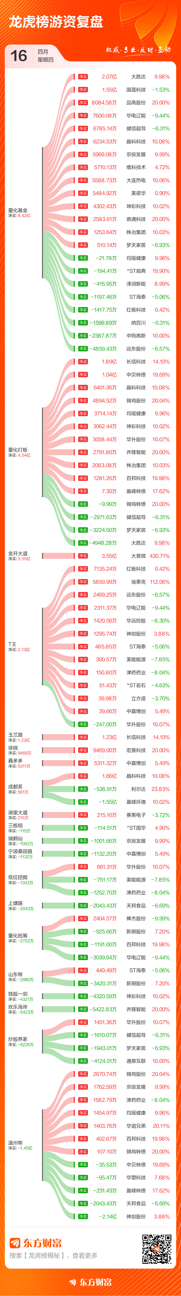 4月16日共有59只个股(含3只可转债)上榜龙虎榜,总上榜成交额300.51亿元。上榜个股中净买入额最高的是中钨高新,金额为9.56亿元。