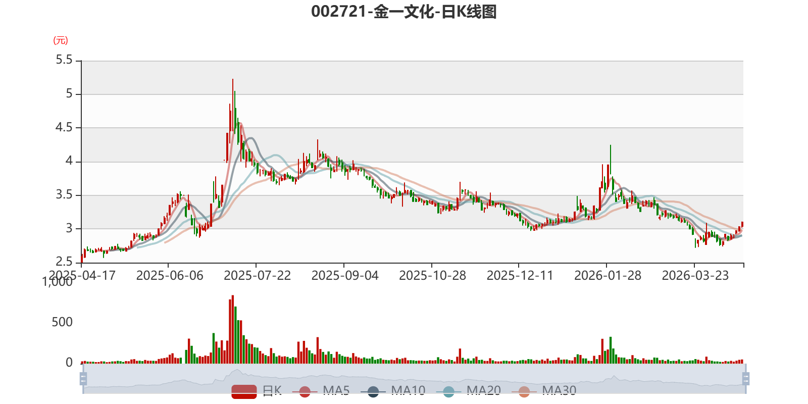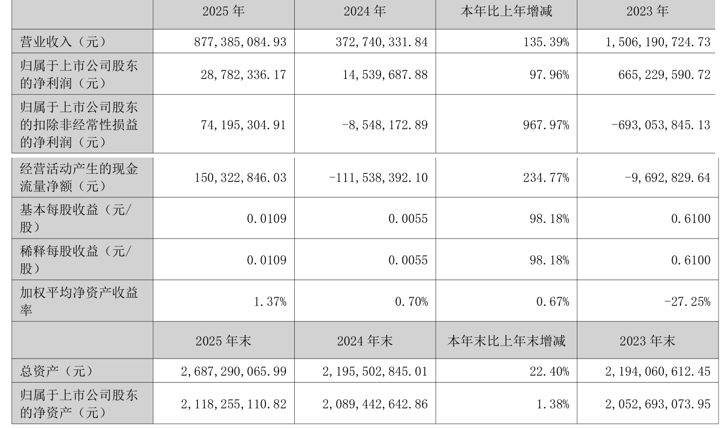 中证智能财讯金一文化(002721)4月17日披露2025年年度报告。2025年,公司实现营业总收入8.77亿元,同比增长135.39%;归母净利润2878.23万元,同比增长97.96%;扣非净利润7419.53万元,同比扭亏;经营活动产生的现金流量净额为1.5亿元,上年同期为-1.12亿元;报告期内,金一文化基本每股收益为0.0109元,加权平均净资产收益率为1.37%。