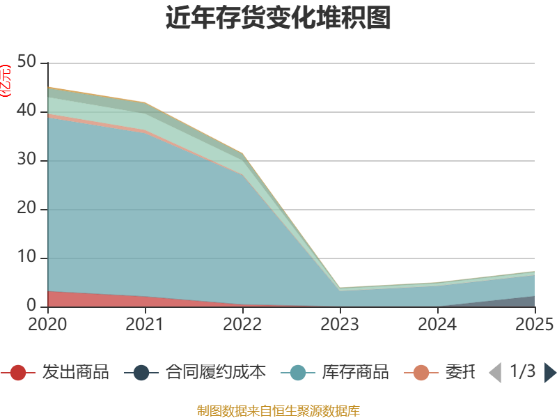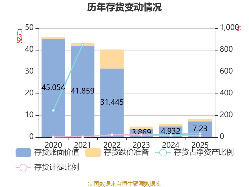 从存货变动来看,截至2025年末,公司存货账面价值为7.23亿元,占净资产的34.13%,较上年末增加2.3亿元。其中,存货跌价准备为1.06亿元,计提比例为12.84%。