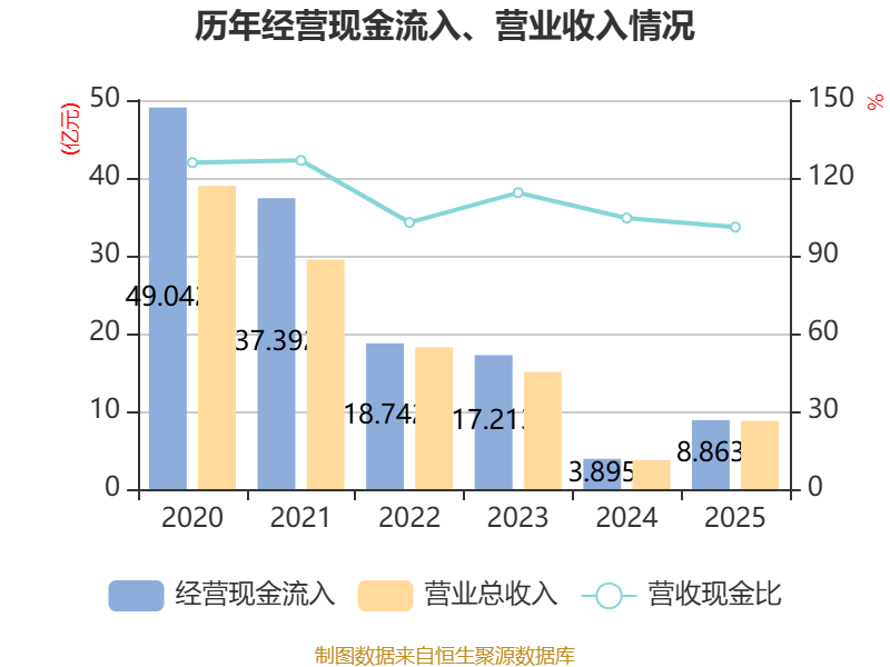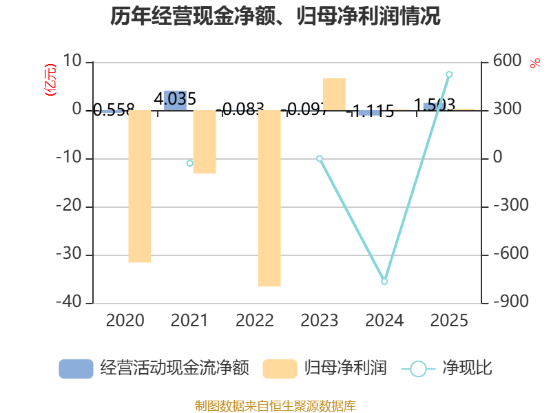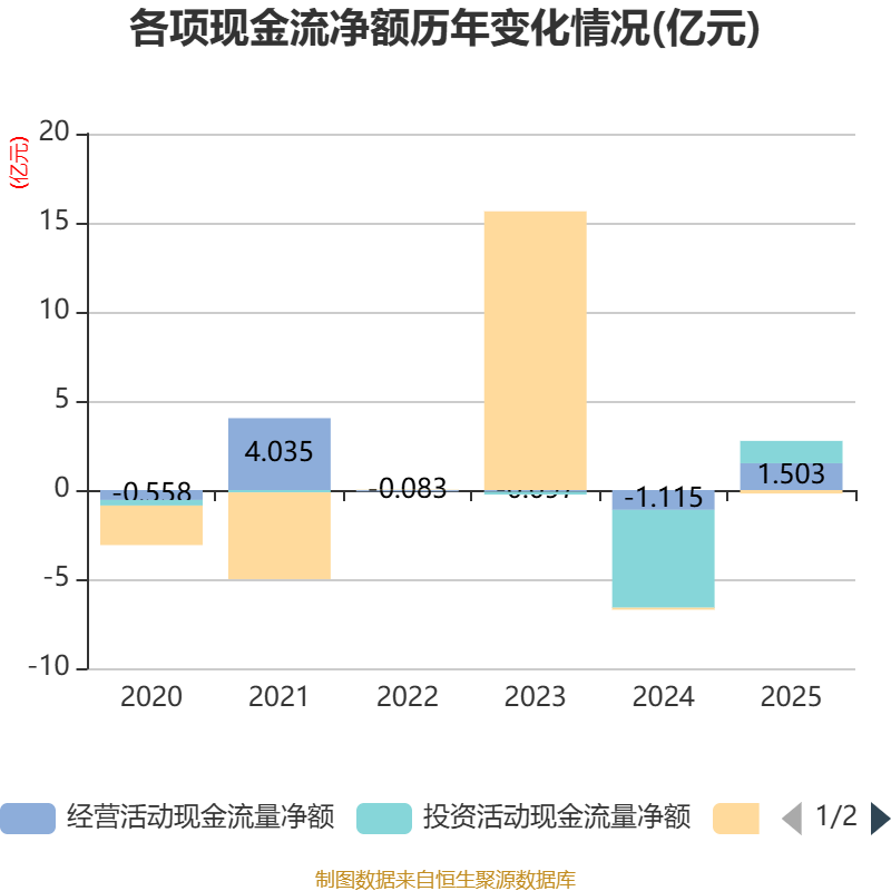 截至2025年,公司经营活动现金流净额为1.5亿元,同比增加2.62亿元;筹资活动现金流净额-1971.02万元,同比减少861.01万元;投资活动现金流净额1.26亿元,上年同期为-5.49亿元。