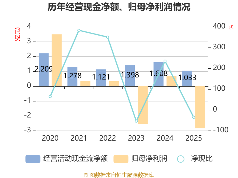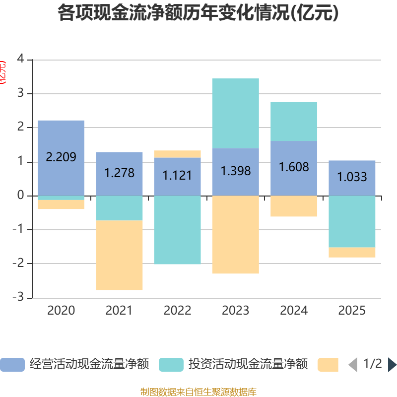 截至2025年,公司经营活动现金流净额为1.03亿元,同比下降35.76%;筹资活动现金流净额-2935.61万元,同比增加3197.44万元;投资活动现金流净额-1.52亿元,上年同期为1.14亿元。