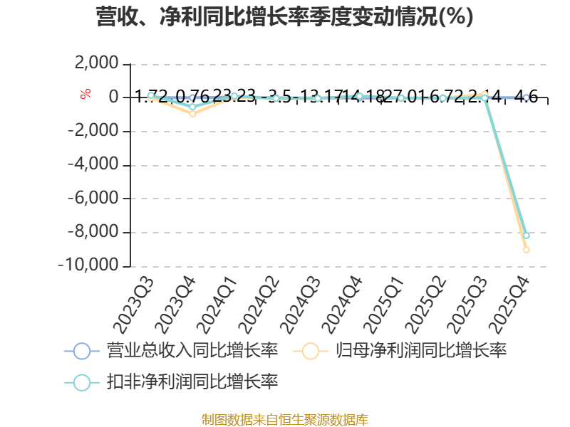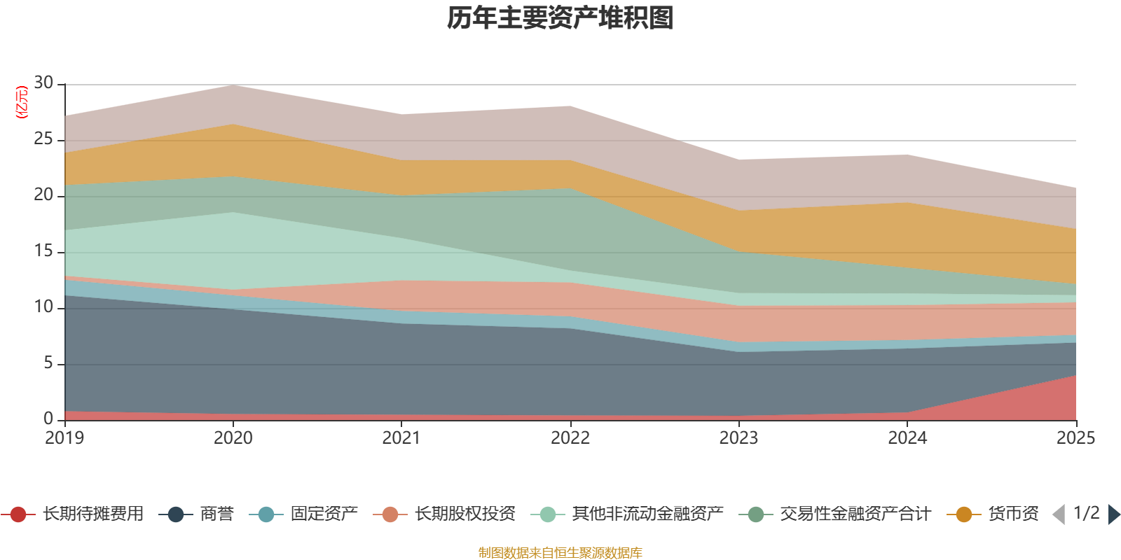 资产重大变化方面,截至2025年末,公司长期待摊费用较上年末增加495.85%,占公司总资产比重上升16.39个百分点;商誉较上年末减少48.67%,占公司总资产比重下降9.95个百分点;交易性金融资产合计较上年末减少56.5%,占公司总资产比重下降4.89个百分点;其他非流动资产较上年末减少77.68%,占公司总资产比重下降2.9个百分点。