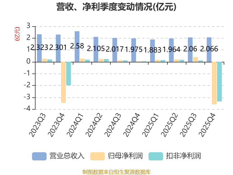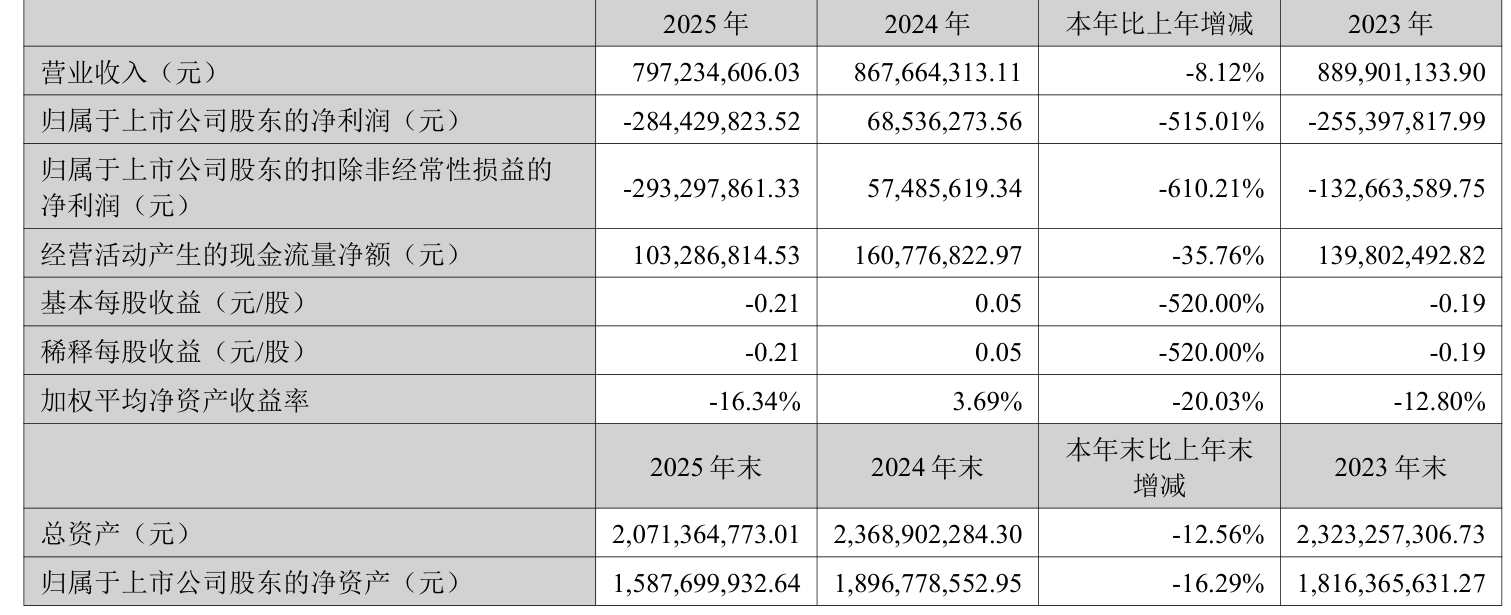 中证智能财讯二六三(002467)4月17日披露2025年年度报告。2025年,公司实现营业总收入7.97亿元,同比下降8.12%;归母净利润亏损2.84亿元,上年同期盈利6853.63万元;扣非净利润亏损2.93亿元,上年同期盈利5748.56万元;经营活动产生的现金流量净额为1.03亿元,同比下降35.76%;报告期内,二六三基本每股收益为-0.21元,加权平均净资产收益率为-16.34%。