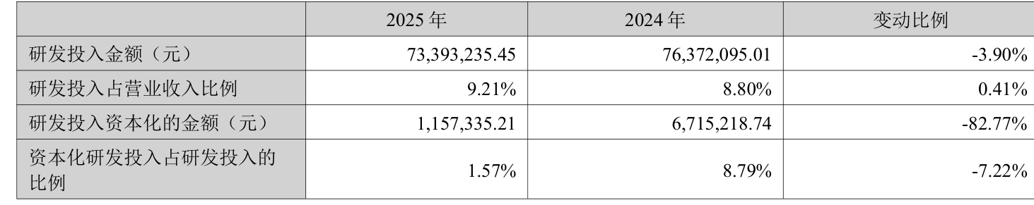 2025年全年,公司研发投入金额为7339.32万元,同比下降3.9%;研发投入占营业收入比例为9.21%,相比上年同期上升0.41个百分点。此外,公司全年研发投入资本化率为1.57%。