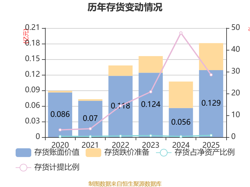 从存货变动来看,截至2025年末,公司存货账面价值为1294.65万元,占净资产的0.82%,较上年末增加737.58万元。其中,存货跌价准备为517.81万元,计提比例为28.57%。