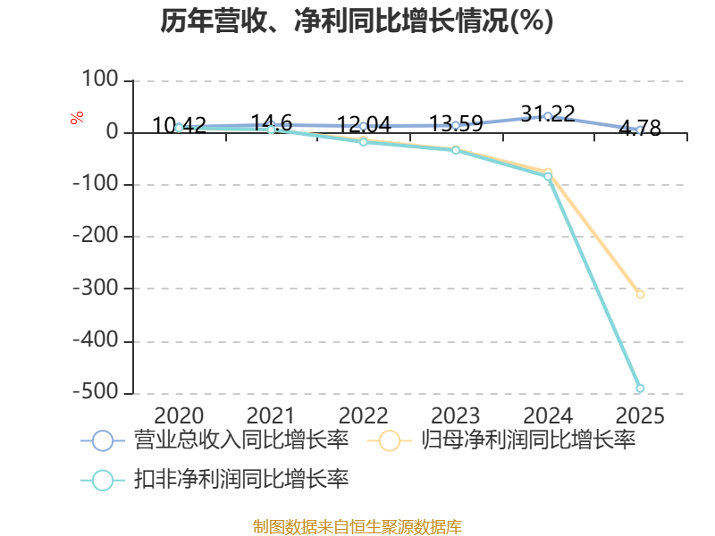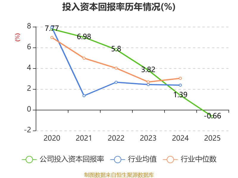 数据显示,2025年公司加权平均净资产收益率为-1.9%,较上年同期下降2.78个百分点。公司2025年投入资本回报率为-0.66%,较上年同期下降2.05个百分点。