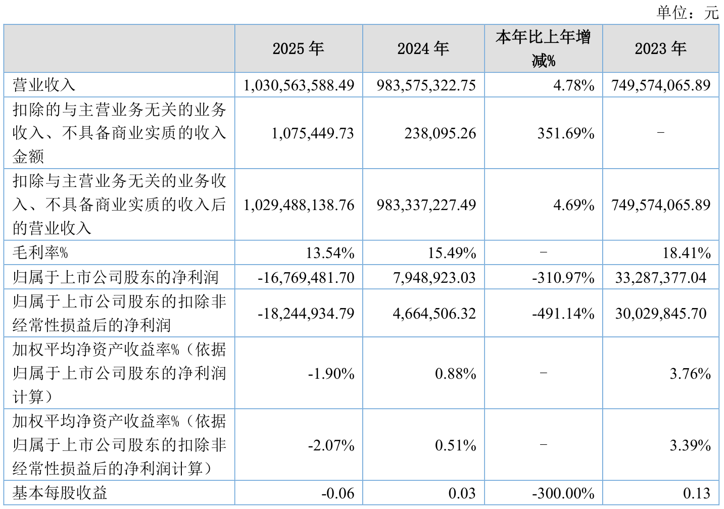 中证智能财讯润农节水(920964)4月16日披露2025年年度报告。2025年,公司实现营业总收入10.31亿元,同比增长4.78%;归母净利润亏损1676.95万元,上年同期盈利794.89万元;扣非净利润亏损1824.49万元,上年同期盈利466.45万元;经营活动产生的现金流量净额为-1529.52万元,上年同期为6950.66万元;报告期内,润农节水基本每股收益为-0.06元,加权平均净资产收益率为-1.90%。