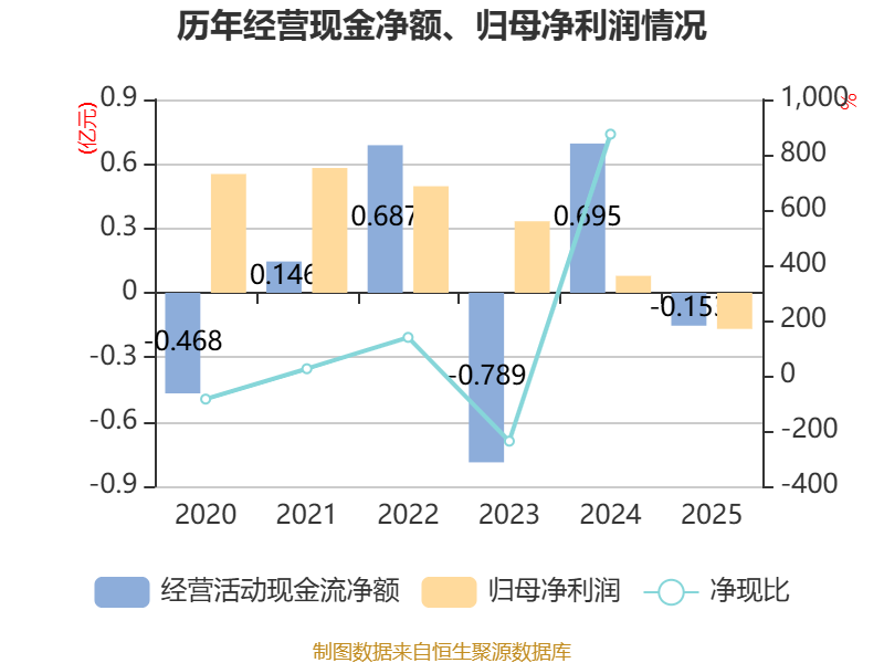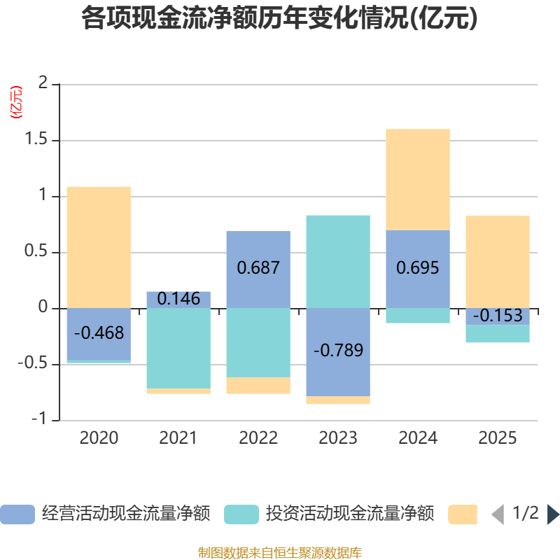 截至2025年,公司经营活动现金流净额为-1529.52万元,同比减少8480.18万元;筹资活动现金流净额8239.41万元,同比减少794.18万元;投资活动现金流净额-1549.31万元,上年同期为-1346.46万元。