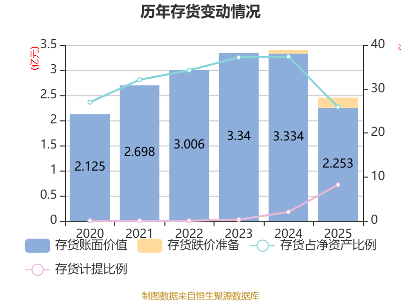 从存货变动来看,截至2025年末,公司存货账面价值为2.25亿元,占净资产的25.9%,较上年末减少1.08亿元。其中,存货跌价准备为2009.44万元,计提比例为8.19%。