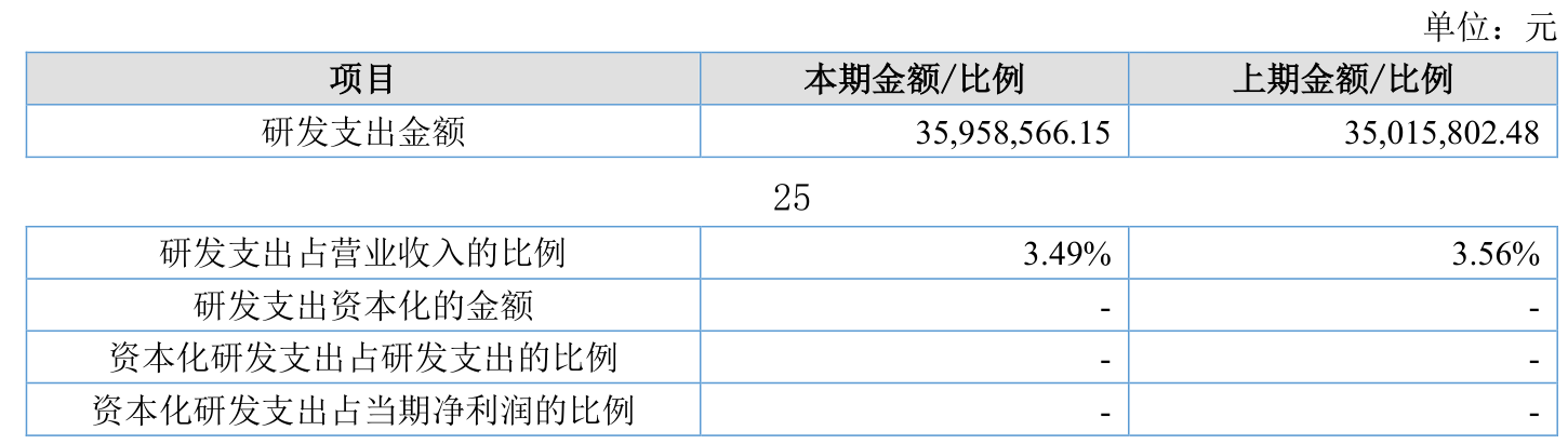 2025年全年,公司研发投入金额为3595.86万元,同比增长2.69%;研发投入占营业收入比例为3.49%,相比上年同期下降0.07个百分点。
