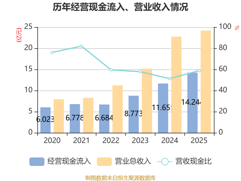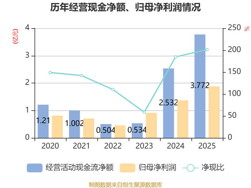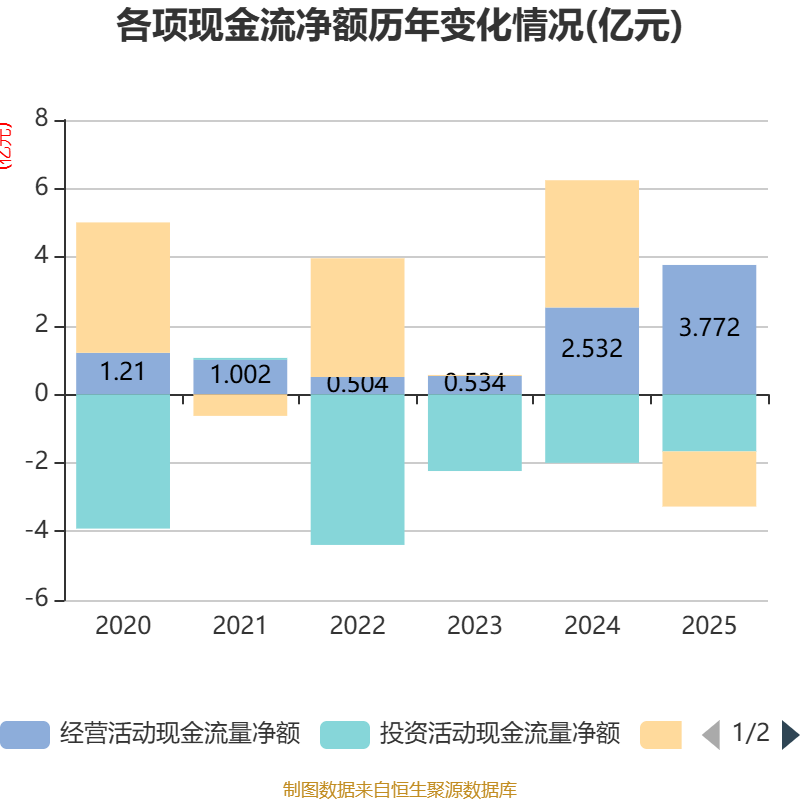 截至2025年,公司经营活动现金流净额为3.77亿元,同比增长48.99%;筹资活动现金流净额-1.61亿元,同比减少5.32亿元;投资活动现金流净额-1.67亿元,上年同期为-2亿元。