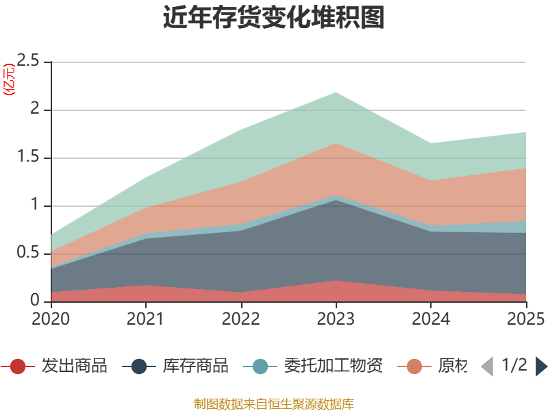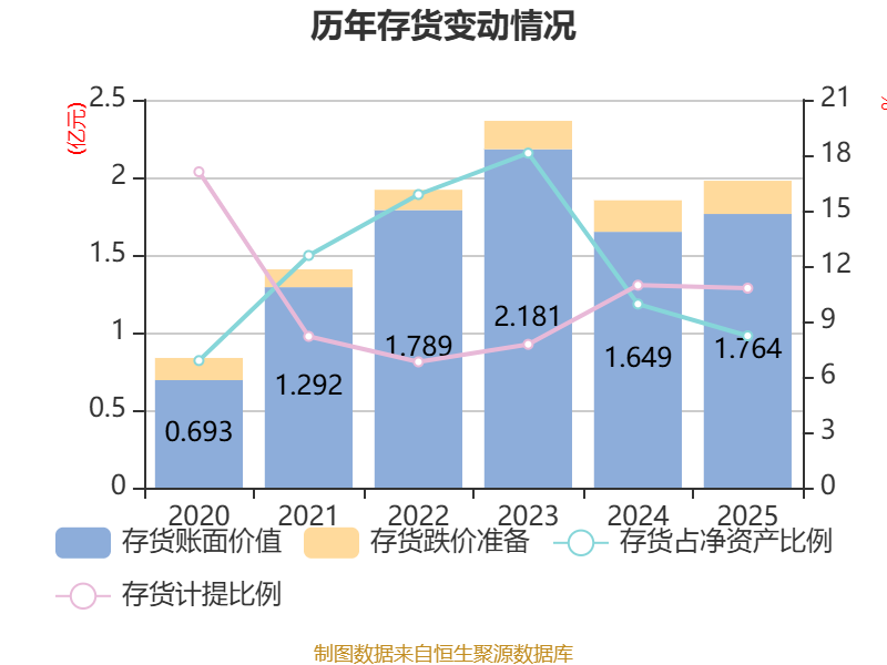 从存货变动来看,截至2025年末,公司存货账面价值为1.76亿元,占净资产的8.22%,较上年末增加1151.57万元。其中,存货跌价准备为2136.22万元,计提比例为10.8%。
