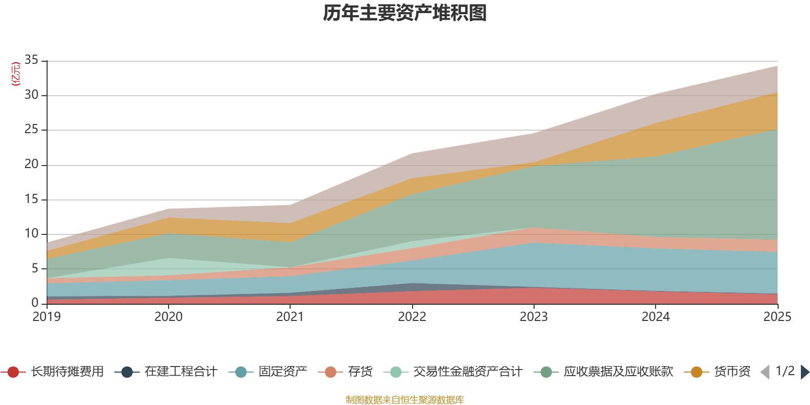 资产重大变化方面,截至2025年末,公司应收票据及应收账款较上年末增加37.54%,占公司总资产比重上升8.17个百分点;固定资产较上年末减少2.17%,占公司总资产比重下降2.78个百分点;长期待摊费用较上年末减少23.12%,占公司总资产比重下降1.89个百分点;应收款项融资较上年末减少44.47%,占公司总资产比重下降1.69个百分点。