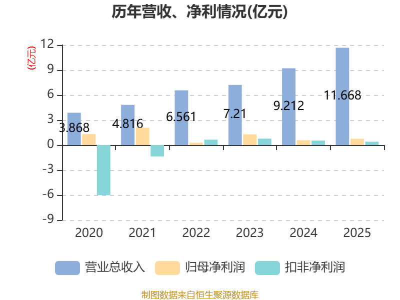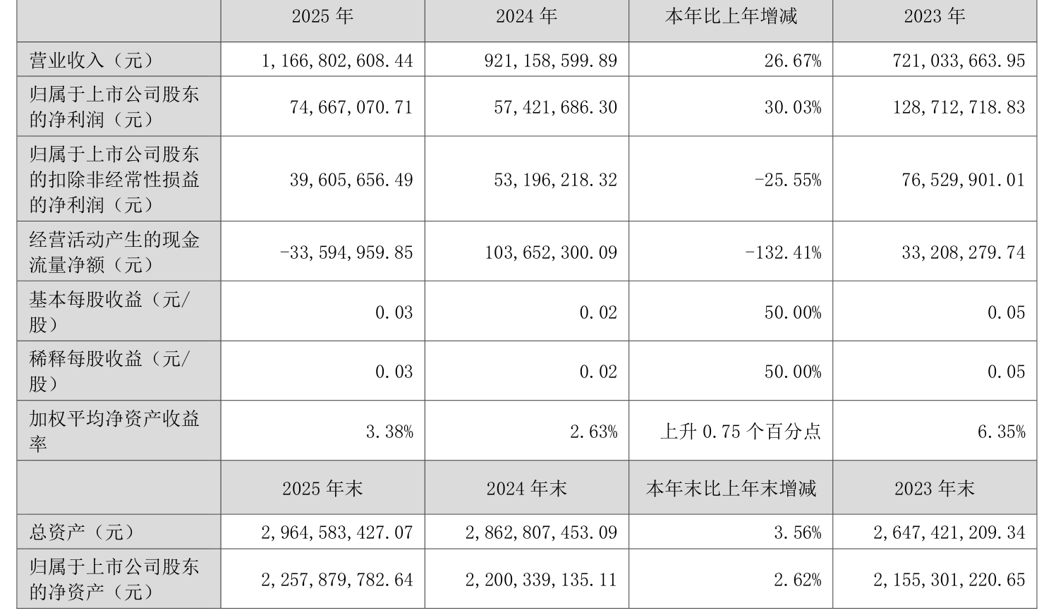 中证智能财讯中南文化(002445)4月17日披露2025年年度报告。2025年,公司实现营业总收入11.67亿元,同比增长26.67%;归母净利润7466.71万元,同比增长30.03%;扣非净利润3960.57万元,同比下降25.55%;经营活动产生的现金流量净额为-3359.5万元,上年同期为1.04亿元;报告期内,中南文化基本每股收益为0.03元,加权平均净资产收益率为3.38%。