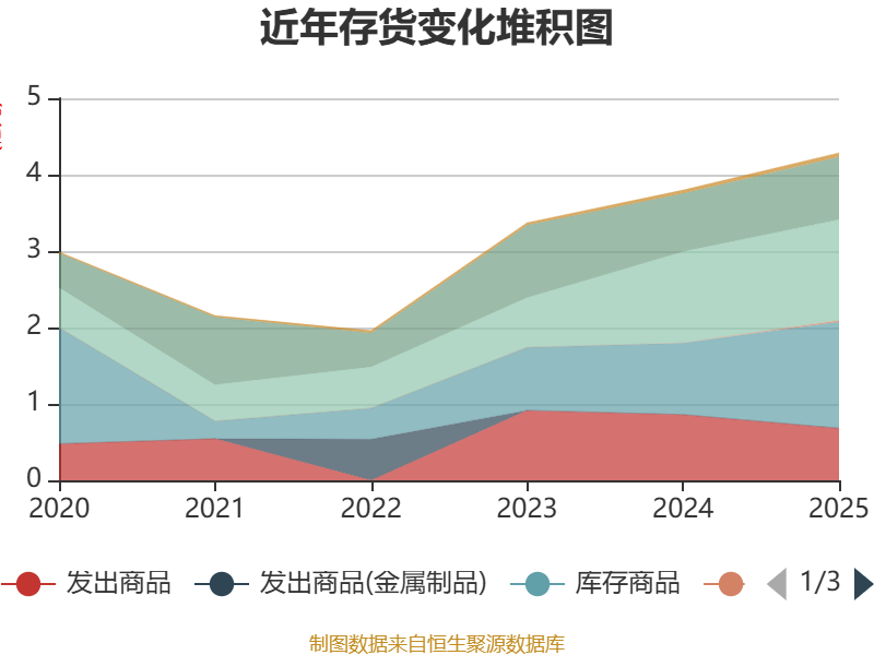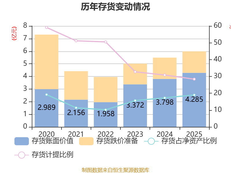 从存货变动来看,截至2025年末,公司存货账面价值为4.28亿元,占净资产的18.98%,较上年末增加4862.17万元。其中,存货跌价准备为1.7亿元,计提比例为28.38%。