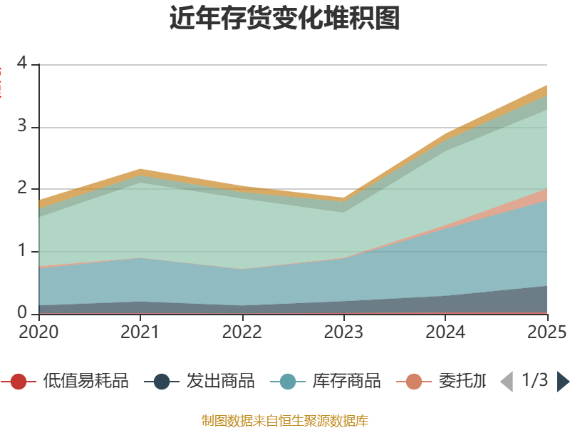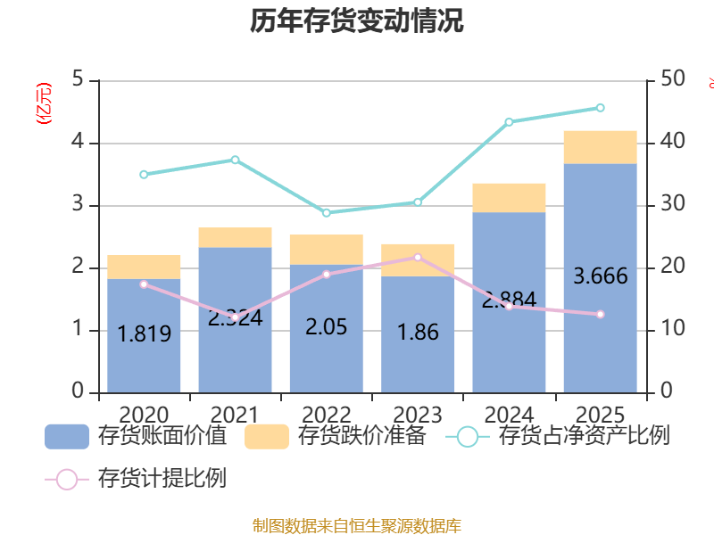 从存货变动来看,截至2025年末,公司存货账面价值为3.67亿元,占净资产的45.59%,较上年末增加7821.82万元。其中,存货跌价准备为5235.67万元,计提比例为12.5%。
