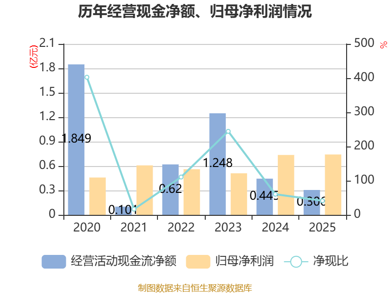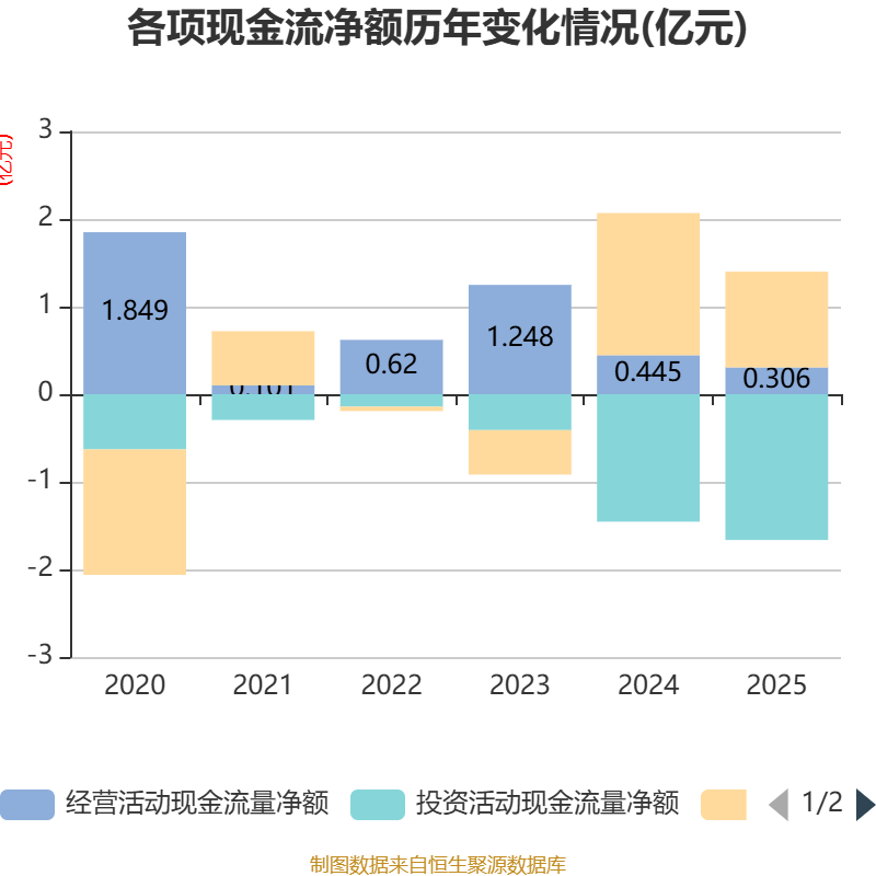 截至2025年,公司经营活动现金流净额为3063.82万元,同比下降31.1%;筹资活动现金流净额1.09亿元,同比减少5290.93万元;投资活动现金流净额-1.66亿元,上年同期为-1.46亿元。