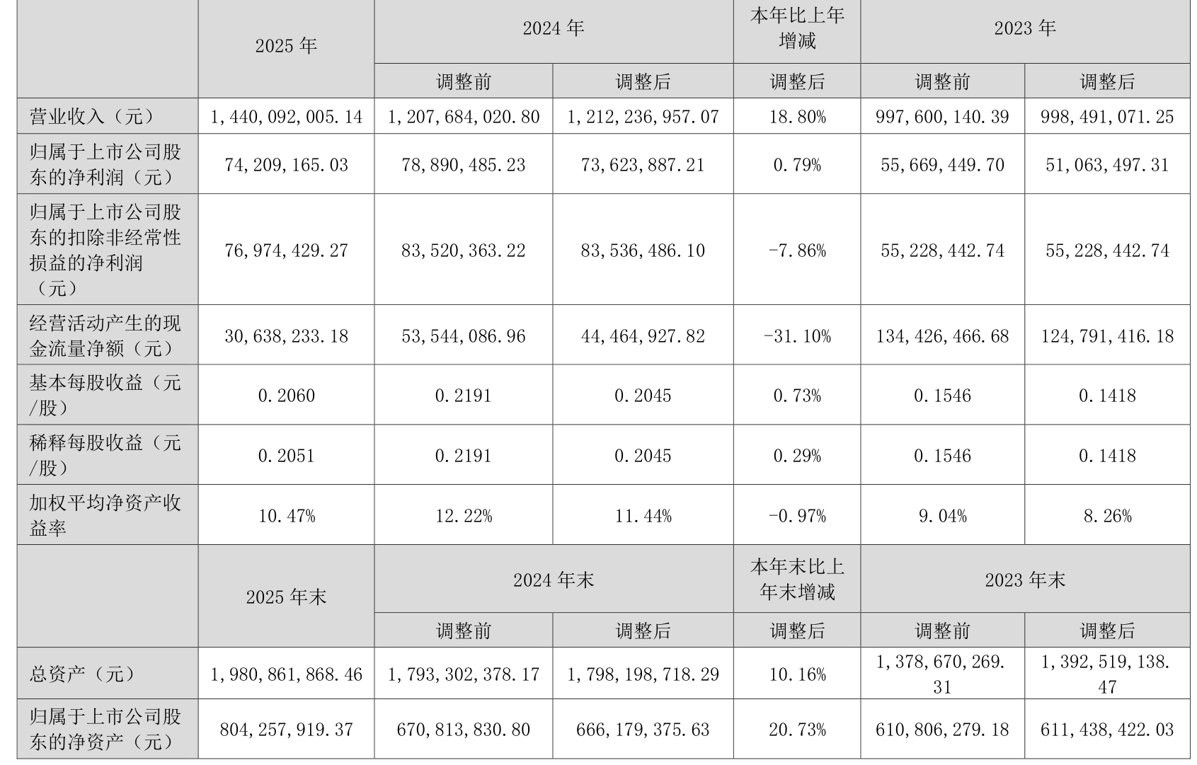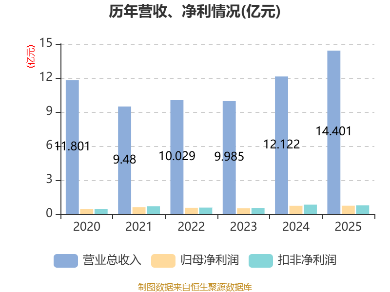 中证智能财讯共达电声(002655)4月17日披露2025年年度报告。2025年,公司实现营业总收入14.4亿元,同比增长18.80%;归母净利润7420.92万元,同比增长0.79%;扣非净利润7697.44万元,同比下降7.86%;经营活动产生的现金流量净额为3063.82万元,同比下降31.10%;报告期内,共达电声基本每股收益为0.206元,加权平均净资产收益率为10.47%。公司2025年度分配预案为:拟向全体股东每10股派现0.3元(含税)。