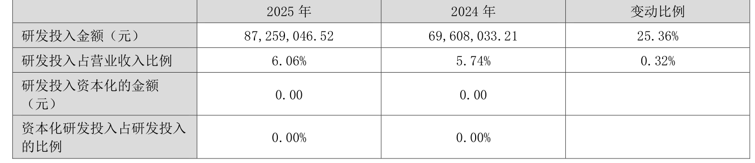 2025年全年,公司研发投入金额为8725.9万元,同比增长25.36%;研发投入占营业收入比例为6.06%,相比上年同期上升0.32个百分点。此外,公司全年研发投入资本化率为0%。