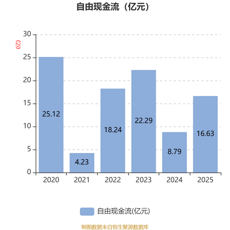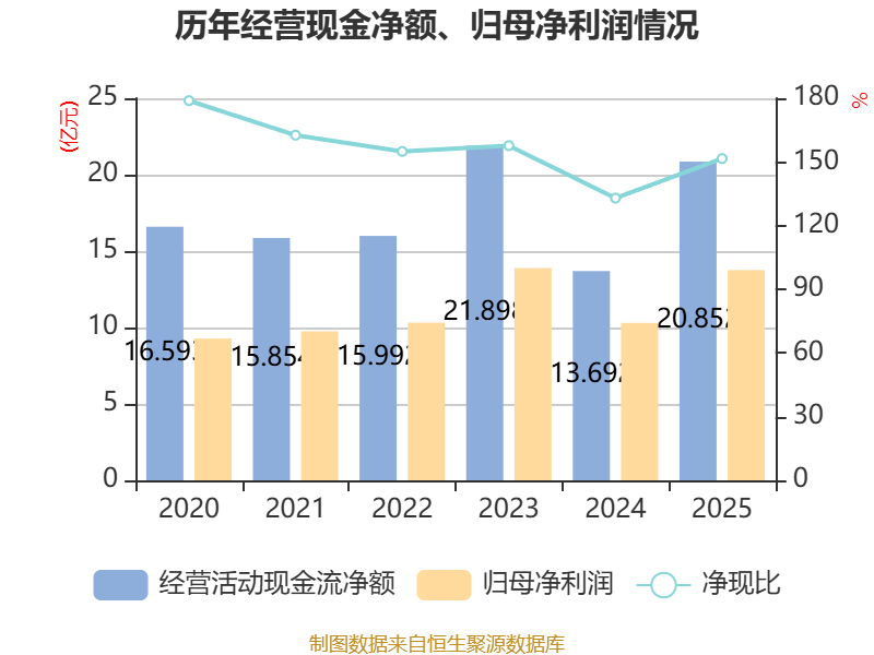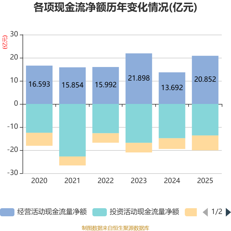截至2025年,公司经营活动现金流净额为20.85亿元,同比增长52.29%;筹资活动现金流净额-6.44亿元,同比减少1.79亿元;投资活动现金流净额-13.63亿元,上年同期为-14.84亿元。