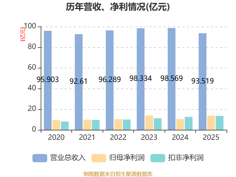 中证智能财讯中原传媒(000719)4月17日披露2025年年度报告。2025年,公司实现营业总收入93.52亿元,同比下降5.12%;归母净利润13.76亿元,同比增长33.57%;扣非净利润13.43亿元,同比增长7.44%;经营活动产生的现金流量净额为20.85亿元,同比增长52.29%;报告期内,中原传媒基本每股收益为1.34元,加权平均净资产收益率为11.58%。公司2025年度分配预案为:拟向全体股东每10股派现6.6元(含税)。