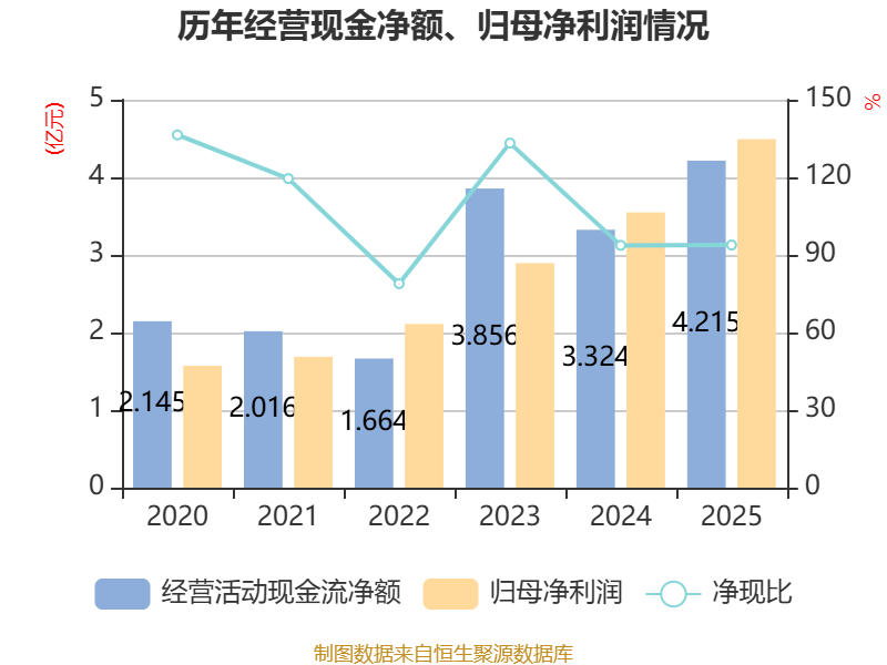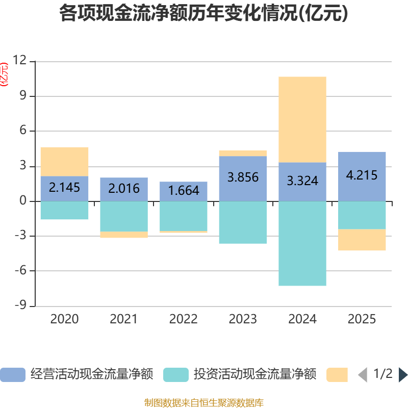 截至2025年,公司经营活动现金流净额为4.21亿元,同比增长26.8%;筹资活动现金流净额-1.81亿元,同比减少9.16亿元;投资活动现金流净额-2.42亿元,上年同期为-7.27亿元。