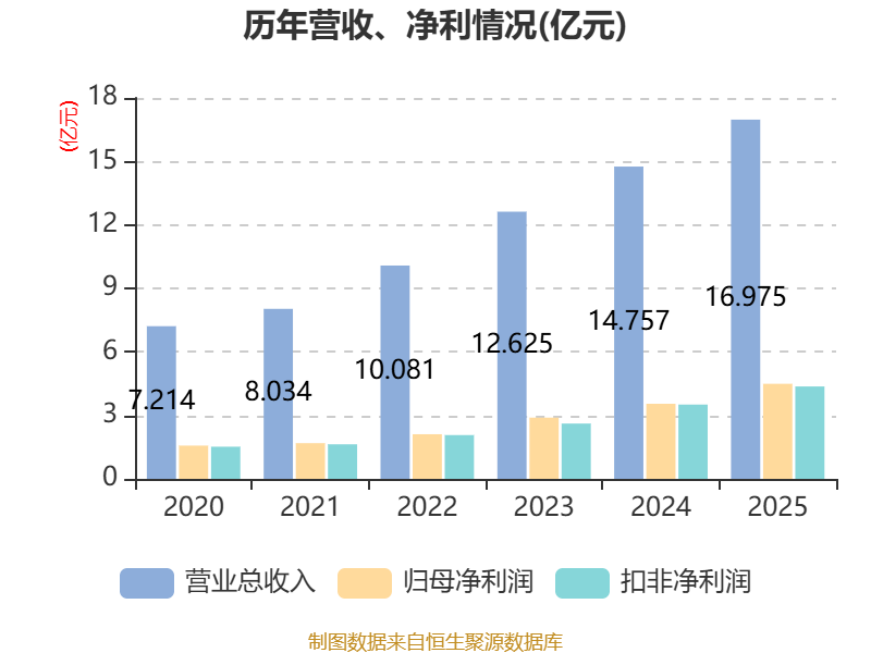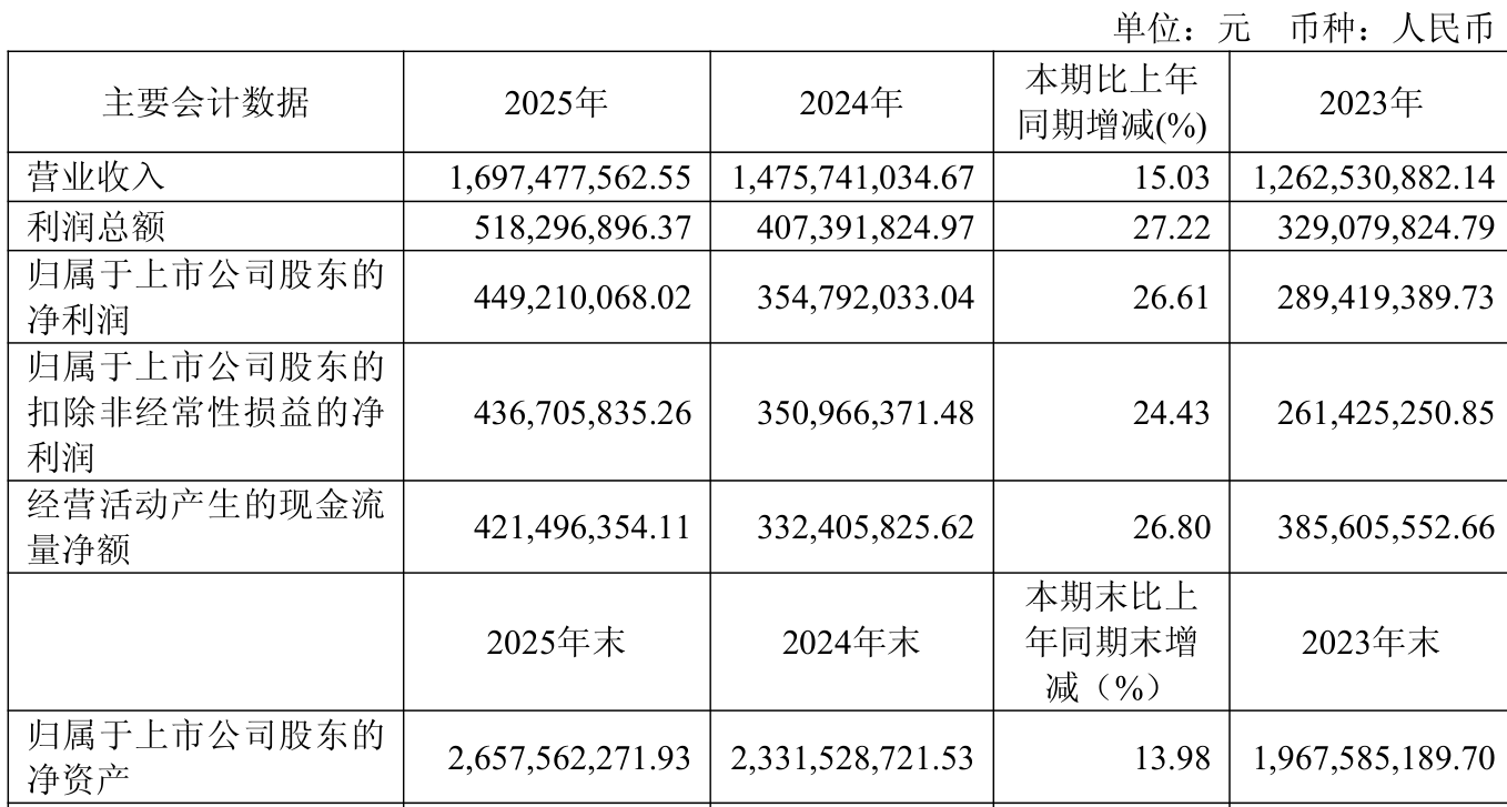 中证智能财讯奥锐特(605116)4月17日披露2025年年度报告。2025年,公司实现营业总收入16.97亿元,同比增长15.03%;归母净利润4.49亿元,同比增长26.61%;扣非净利润4.37亿元,同比增长24.43%;经营活动产生的现金流量净额为4.21亿元,同比增长26.80%;报告期内,奥锐特基本每股收益为1.12元,加权平均净资产收益率为22.05%。公司2025年度分配预案为:拟向全体股东每10股派现3.4元(含税)。