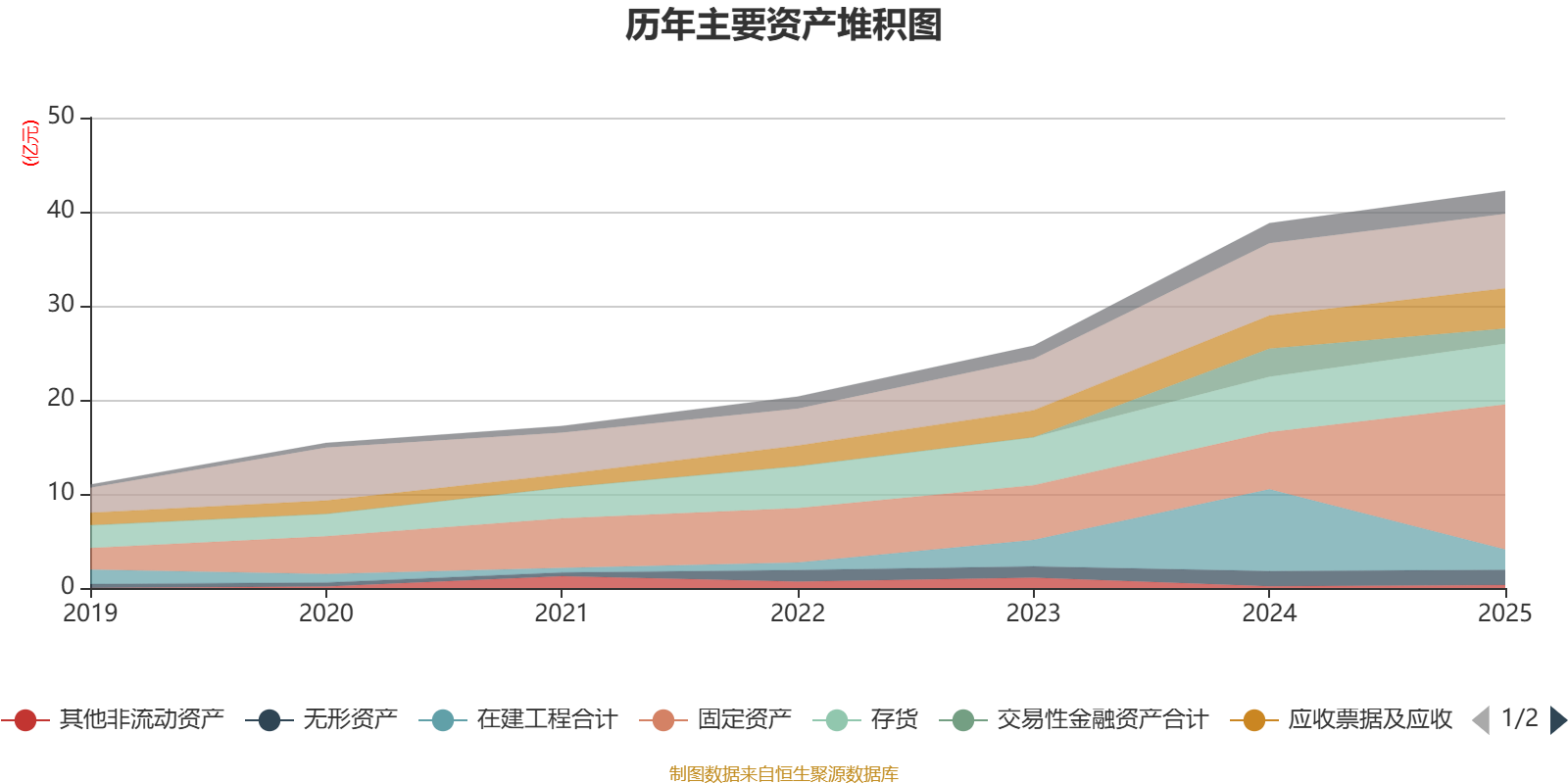 资产重大变化方面,截至2025年末,公司固定资产较上年末增加153.87%,占公司总资产比重上升20.84个百分点;在建工程合计较上年末减少75.01%,占公司总资产比重下降17.28个百分点;交易性金融资产合计较上年末减少46.13%,占公司总资产比重下降3.91个百分点;应收票据及应收账款较上年末增加22.49%,占公司总资产比重上升1.13个百分点。