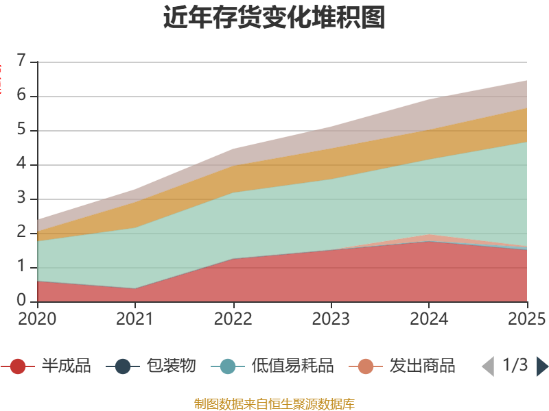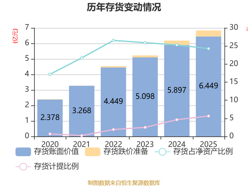 从存货变动来看,截至2025年末,公司存货账面价值为6.45亿元,占净资产的24.27%,较上年末增加5515.95万元。其中,存货跌价准备为3849.1万元,计提比例为5.63%。