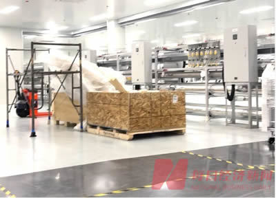 生产车间的大门洞开,每经记者走进去观察发现:地上堆砌着一些杂物和废弃包装、建材等物料,还有一些没拆封的设备和施工使用的金属脚手架,一个空的仪器柜也没有关上大门。每经记者还看到有人员在显示屏上调试,也有人员在搬运管线状材料,上述人员依然未穿着无尘车间的防护服和装备。