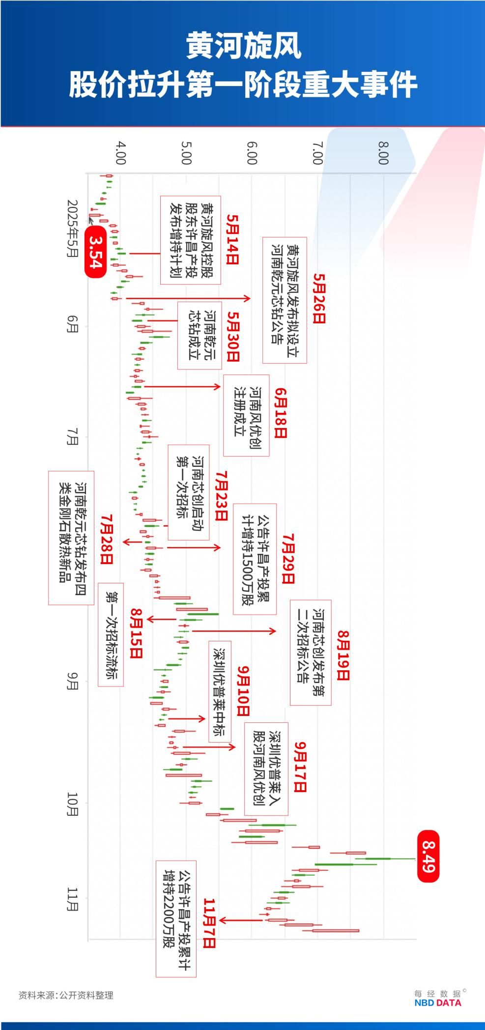 黄河旋风的股价从2025年5月15日收盘价3.86元/股,到2025年10月23日股价来到近三年新高的8.49元/股,在五个月的时间内股价最高涨幅近120%。