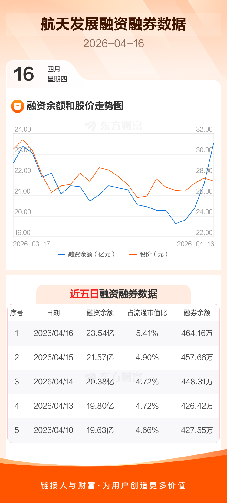 交易所最新数据显示,航天发展于2026年4月16日获融资买入6.55亿元,融资偿还4.57亿元,当日融资净买入1.98亿元。目前,该股融资余额23.54亿,占流通市值比例为5.41%。