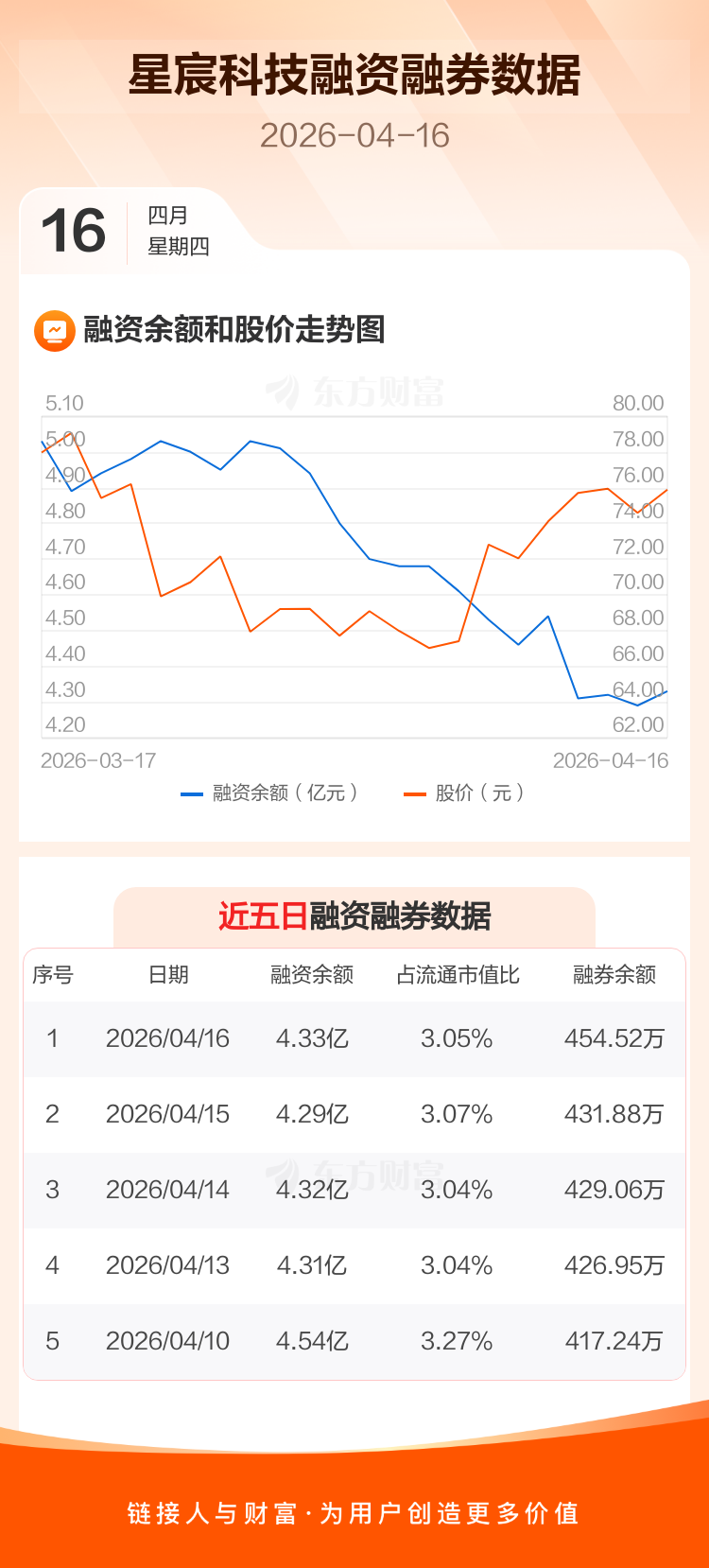 交易所最新数据显示,星宸科技于2026年4月16日获融资买入2257.62万元,融资偿还1807.26万元,当日融资净买入450.36万元。目前,该股融资余额4.33亿,占流通市值比例为3.05%。