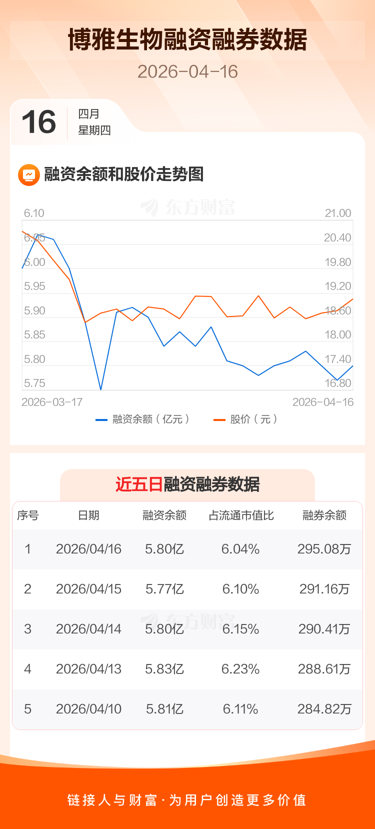 交易所最新数据显示,博雅生物于2026年4月16日获融资买入1620.29万元,融资偿还1289.05万元,当日融资净买入331.24万元。目前,该股融资余额5.80亿,占流通市值比例为6.04%。