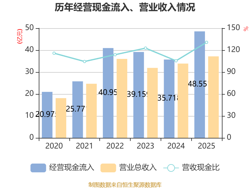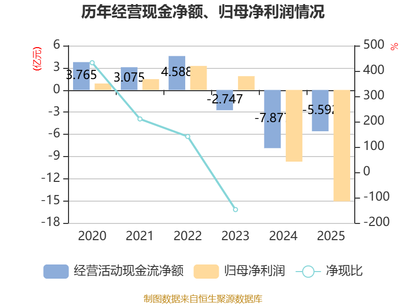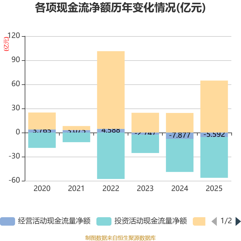 截至2025年,公司经营活动现金流净额为-5.59亿元,同比增加2.28亿元;筹资活动现金流净额64.72亿元,同比增加40.32亿元;投资活动现金流净额-50.74亿元,上年同期为-41.16亿元。