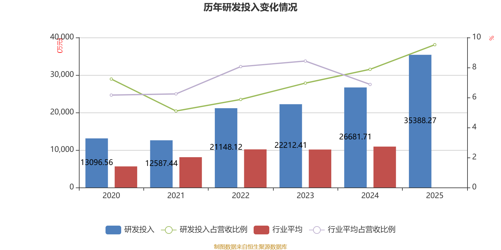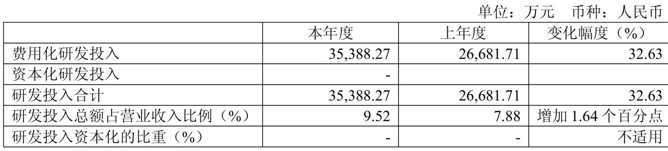 2025年全年,公司研发投入金额为3.54亿元,同比增长32.63%;研发投入占营业收入比例为9.52%,相比上年同期上升1.64个百分点。