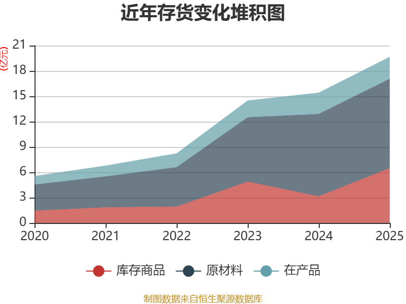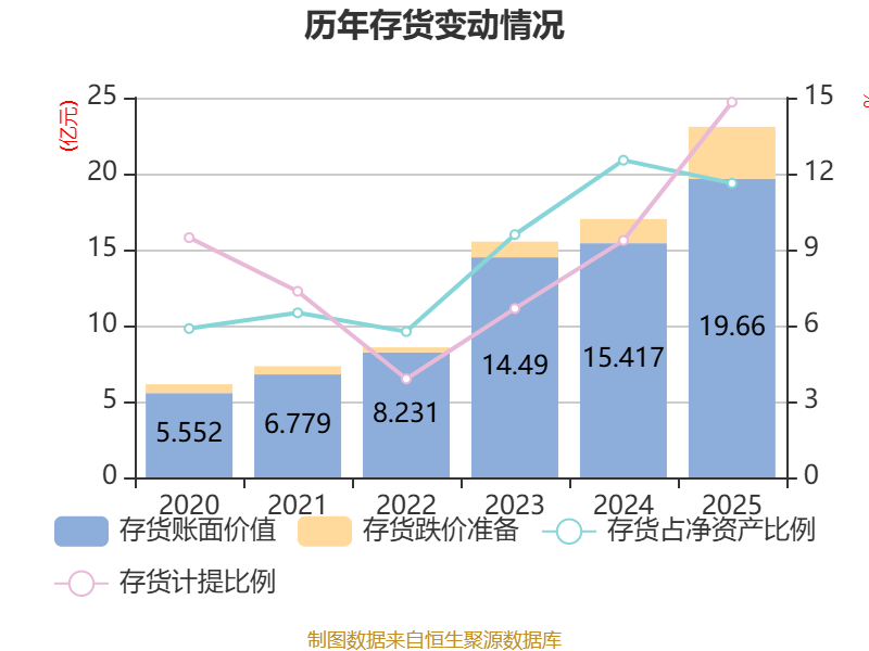 从存货变动来看,截至2025年末,公司存货账面价值为19.66亿元,占净资产的11.62%,较上年末增加4.24亿元。其中,存货跌价准备为3.42亿元,计提比例为14.82%。