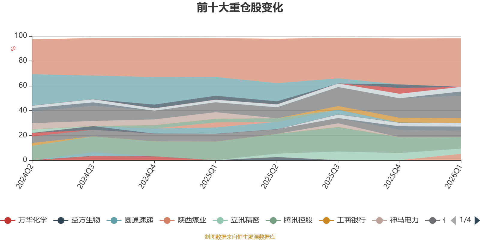 该基金持股集中度较高,近2年前十大重仓股集中度长期超过60%。截至2026年一季度末,基金十大重仓股分别是宁德时代、腾讯控股、伟明环保、陕西煤业、立讯精密、紫金矿业、中国太保、中通快递-W、华润万象生活、海大集团。