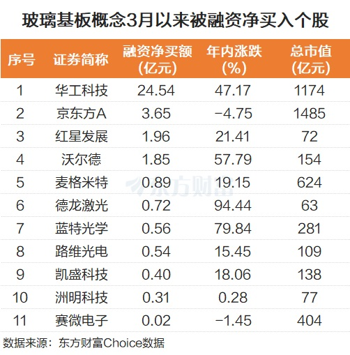 个股而言,玻璃基板概念中,华工科技3月以来被融资净买入24.54亿元。京东方A、红星发展、沃尔德也被融资净买入过亿,分别为3.65亿元、1.96亿元和1.85亿元。