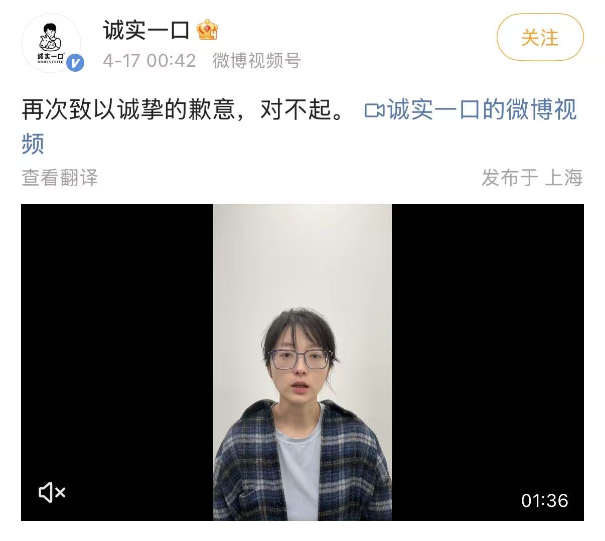 4月17日凌晨近1点,诚实一口创始人吕依凌再次致歉,她在视频中称:“实在抱歉以这样的方式与熠然的粉丝宝宝们见面,首先向大家郑重的致歉,直播间的恶劣言论对熠然和喜欢熠然的大家都造成了严重的伤害,这是我们公司管理上的严重失责,在此我有责任站出来去面对这个问题,并承担这个后果。”