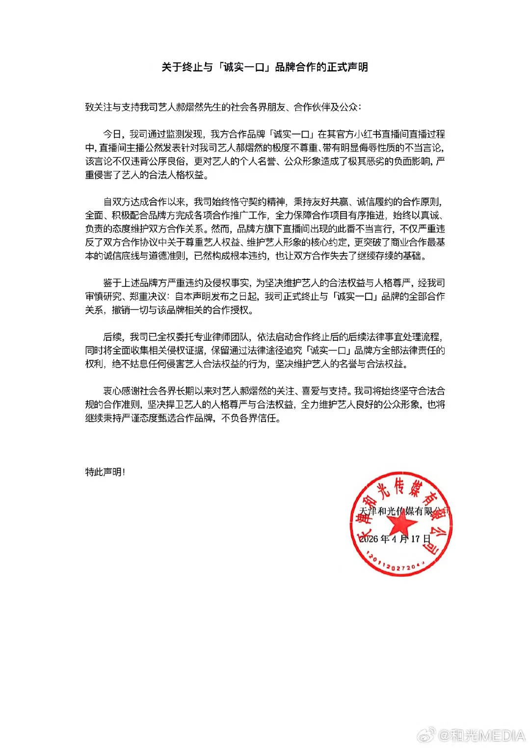 和光传媒在声明中表示,通过监测发现,合作品牌诚实一口在其官方小红书直播间直播过程中,直播间主播公然发表针对公司艺人郝熠然的极度不尊重、带有明显侮辱性质的不当言论,该言论不仅违背公序良俗,更对艺人的个人名誉、公众形象造成了极其恶劣的负面影响,严重侵害了艺人的合法人格权益。