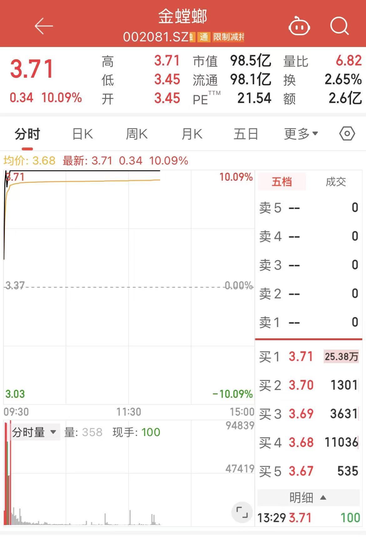4月17日,建筑装饰行业龙头企业金螳螂(002081.SZ)在开盘后直线拉升并封死涨停板,截至13时29分,股价报3.71元/股,涨幅达10.09%,封单超25万手。