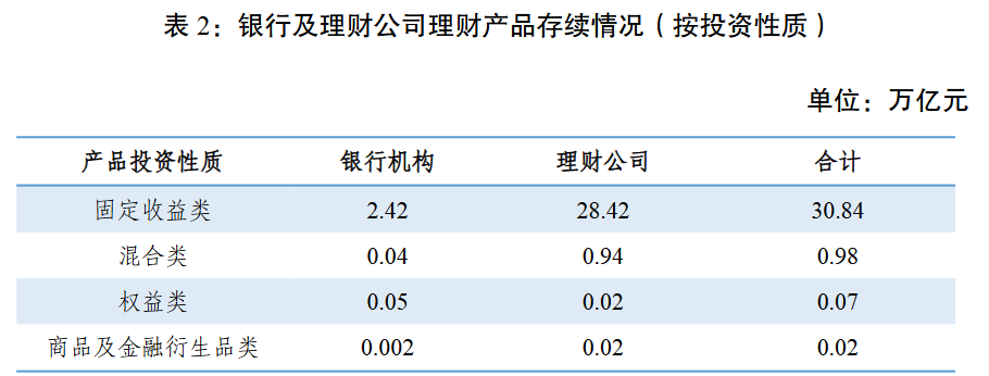 从理财产品类型结构上看,截至2026年一季度末,固定收益类产品存续规模为30.84万亿元,占全部理财产品存续规模的比例达96.65%,较去年同期减少0.57个百分点;混合类产品存续规模为0.98万亿元,占比为3.07%,较去年同期增加0.60个百分点;权益类产品和商品及金融衍生品类产品的存续规模相对较小,分别为0.07万亿元和0.02万亿元。